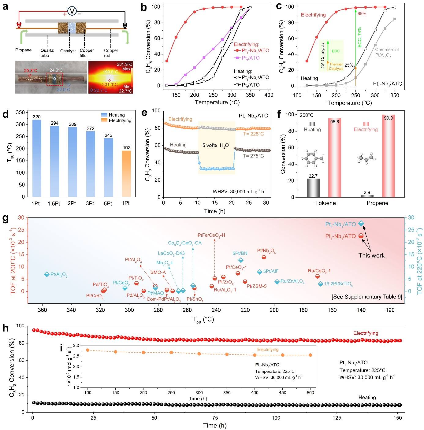 在本工作中,研究团队成功在导电氧化物载体上构筑了原子级精准的Pt1-Nb1异核双原子催化剂。性能测试结果表明,在施加微弱电流后,该催化剂的丙烷催化燃烧活性发生跃迁式提升,完全转化温度(T90)从传统热催化的320°C大幅降低至192°C,其催化活性(TOF)远超文献已报道的记录。更具实际意义的是,该策略可将贵金属Pt用量降低80%以上,并在同等活性下节省超过90%的能耗,展现出巨大的工业应用潜力和经济价值。